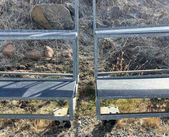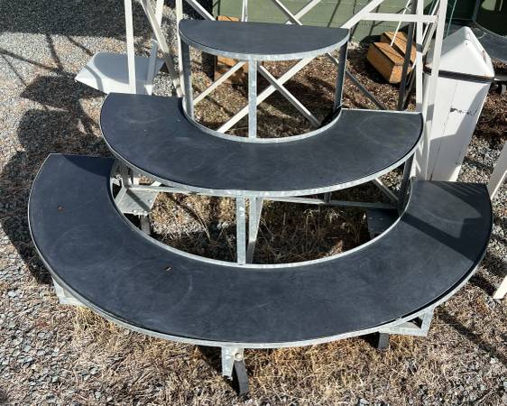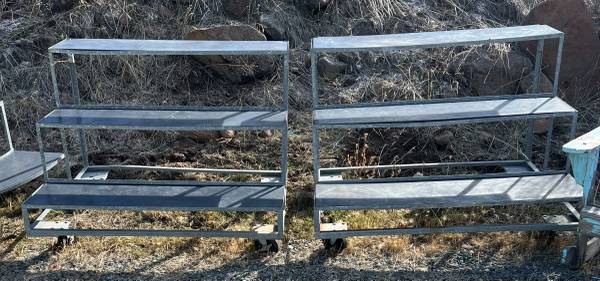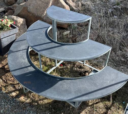 Here are some great plant stands with heavy duty wheels for your deck. I have 4 each round ones and 2 each square ones your choice $75 each. The shelves come out to make it easy for 2 people to carry these when loading them up. Galvanized steel will not rust made for outdoor use.
