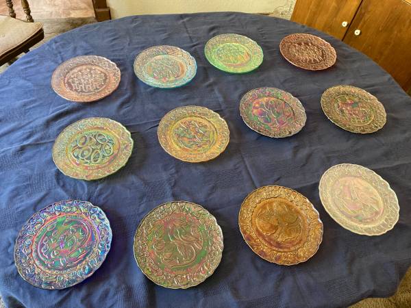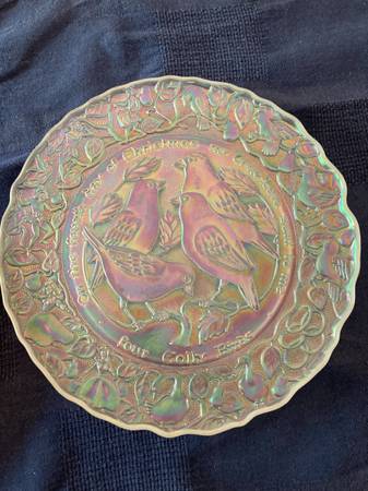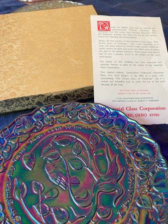 12 days of Christmas Imperial carnival glass collector plates issued in 1970. Each plate is a different color with great detail. Comes with 8 original gold boxes and several original manufacturer's description cards by the Imperial Glass Company.
