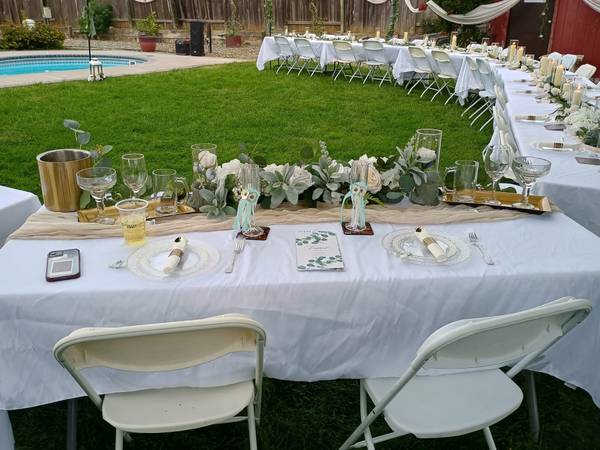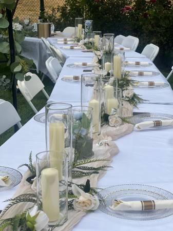 All items are still in great condition, we used beautiful throw away dishes that we can share link if interested. We had Mexican food, so we had a variety of drink options of beer, margaritas and wine. All the small items added in this package helped to make the small details really feel elevated. Everything is packaged well to ensure no items break and can be stored by stacking most boxes. We had an incredible amount of compliments from the guests of the elegant and romantic settings we created. This set will make a wedding/reception an event to never forget. Every dish and cloth were washed and stored to maintain it still looking brand new. No stains on fabrics. I paid over $1k for all decorations, and am glad to share the beauty for someone else.